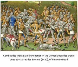 To explain, there was a struggle between the House of Montfort and House of Blois for control of the Duchy of Brittany, which was during the Hundred Years War between France and England. The English supported the Montfort’s and France supported the Blois family, however, by March 1351 the war had reached an impasse, with each side controlling different parts of Brittany, while making raids into the other part.